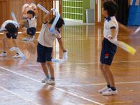 今回はその1回目。1.2年生の児童は、指導者の説明や指示を聞きながら気持ちよく体を動かして楽しい時間になりました。あっという間の2時間で、どの子も楽しかったと満足そうにしていました。時間の終わりには、まとめとして体育館で練習したことを、運動場に出て、みんなで表現しました。