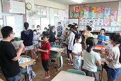 3・4年生総合的な学習の時間『みんなが幸せな世の中に』で、ユニバーサルデザインについての理解や視覚障がい者の方とのふれあいなどの学習を通して、「障がいがある人もない人も みんな同じように生きている。」ということに気付けました。そして、聴覚障がい者の方の学習で手話についても学びました。3・4年生は、全校で歌っている『地球星歌』の一部を手話で歌えるようになりました。そこで今日は、5・6年生に対してできるようになった手話を教え、一緒に歌ってみようという活動を行いました。画像は2~4人グループで3・4年生から教える活動の様子です。最後は、みんなで一緒に手話による『地球星歌』を合唱しました。