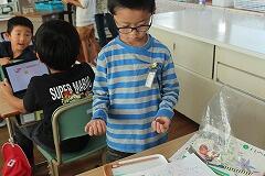 1・2年生は合同で生活科の学習を行っています。2年生は、学級園に野菜の種(にんじん、大根)を植えていました。にんじんは細長い種、大根は丸い種であることを教えてもらい、一粒ずつ大切に植えてやさしく土をかぶせていました。隣の学級園で1年生は、落花生の収穫をしてました。袋に入った落花生を見せながら、家で食べることをうれしそうに話していました。また、チューリップの球根を観察して、4つの方向から見た絵を描いたり、手触り、色、大きさ、重さなどを観察して文章で書いていました。観察の中で、重さが気になった児童は、自分の消しゴムを持ち重さ比べをしていました。1つの球根に対してじっくりと観察する姿が研究者のようでした。