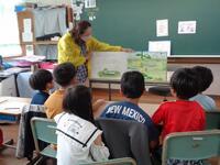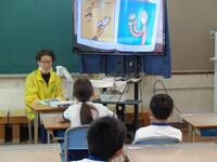 本校では、月に2回程度の計画で、地域の方に読み聞かせボランティアをしていただいています。ボランティアの方6名が来校されました。校長室で準備をされ、担当学年の児童の迎えによって、各教室へ移動して読み聞かせが行われました。大型絵本を開いたり、実物投影機で大型テレビに映したりしながら読み聞かせをされていました。それぞれの方が、学年に応じた本を選んで準備してくださっています。