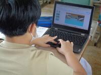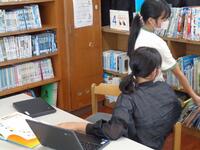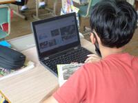 6年生の社会科の学習で、児童が端末を使って、学習のまとめをしていました。「自然災害からの復興」について、スライドにまとめていました。参考にするのは、教科書や資料集、ネットからの情報、図書室にある図書です。それぞれの児童が自分のペースで、自分の机でまとめたり、カメラで資料を写して挿入したり、図書室に移動したりしていました。その間、担任は子ども達の画面を自分のPCで共有して、ぞれぞれの進み具合を確認しながら助言をしたり、よさを伝えたりしています。教師や児童の端末の活用は、これからもっともっと進んでいきます。
