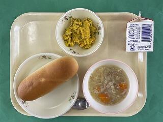今日の給食:10月11日(水) メニュー【ABCスープ、かぼちゃサラダ、チーズパン、牛乳】