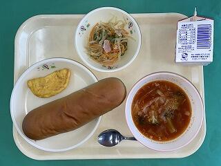 今日の給食:9月8日(金) メニュー【ツナマヨオムレツ、もやしのカレー和え、ミネストローネ、黒糖パン、牛乳】