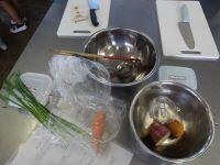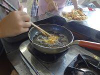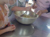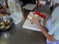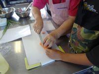 次に早速、グループに分かれて、調理開始です。アドバイスを受けながら、上手に包丁を使い、野菜を切ったり、油で揚げたりできました。