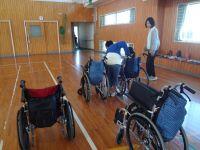 ②体育館に移動し、「アイマスク体験」「目の見えない方のためにお金や身近なものの工夫」「車いすの歴史」「車いす体験」を行う、でした。