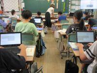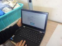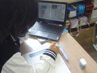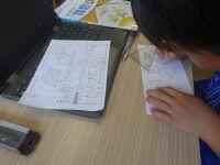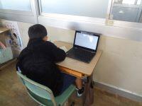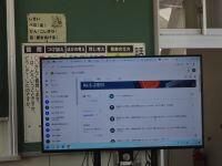 子どもたちは、まず教科書の日付歌と曜日歌をテレビ画面で映し出された教科書の映像を見ながら音読しました。次に、クラスルームのスライドを見ながら、個別に練習しました。