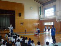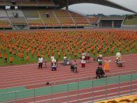 また、午後から、全児童で国スポ・障スポのダンスを踊りました。1600名以上の児童が、いただいたお揃いのTシャツを着て、踊ると迫力があって、とてもよかったです。ぼんちくんやみやざき犬も参加し、踊りに彩りを添えました。