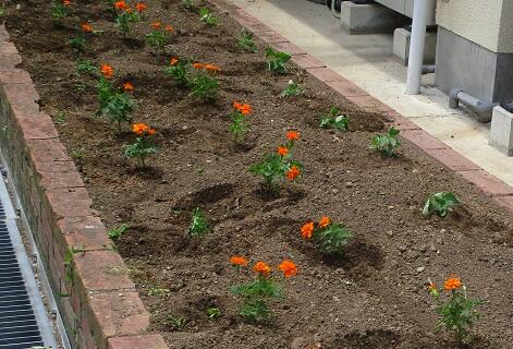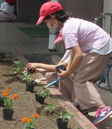 ところで、梅雨の合間の晴れた日に、玄関付近にある花壇に花を植えました。今回植えたのはマリーゴールドとサルビアです。種から育てましたが、毎日の水やり等気をつけながらお世話をしました。花も花壇に移植できるほど成長してきましたので、栽培委員会の子供たちが花植えの作業を頑張りました。花と花の間隔に気を付けて、丁寧に植えました。何もなかった花壇にきれいな花が並び、とてもうれしくなりました。これからきれいな花がみれるので、とても楽しみです。