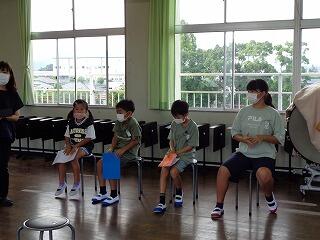 写真は、始業式の様子です。代表者だけ集めて(指導代表のことば3名、校歌伴奏1名)、他の児童は各教室でオンラインにて参加しました。感染者急増中でしたので、校歌は演奏を聞くだけとしました。