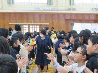 3月28日(木)に、高城小学校を退職・転出される先生方との離任式が行われました。今回の定期異動で、本校から11名の先生方が離任することになりました。離任式では、子どもたちが先生方の話をしっかり聞いていました。先生方の最後のお話を、いろいろな思いをもって聞いていたと思います。花道を通る先生方とのお別れでは、涙を流す子どもたちがいて、とても感動的でした。子どもたちは、先生方との思い出をきっと大切にすることでしょう。離任される先生方のご活躍を願っています。
