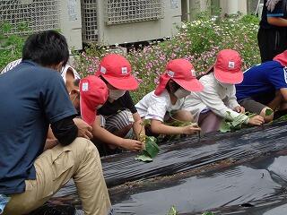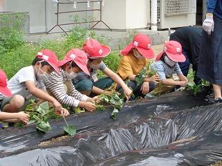 2校時、2年生がサツマイモの苗を植えていました。