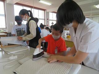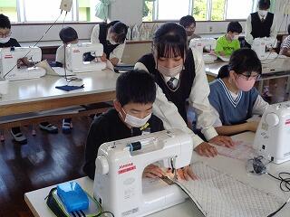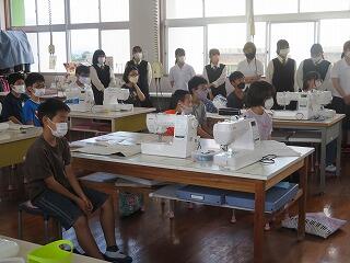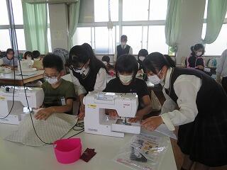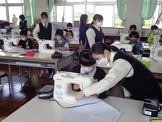 6年生家庭科において、ナップザックづくりがあり、高城高校、生活文化科の生徒とのミシン学習です。