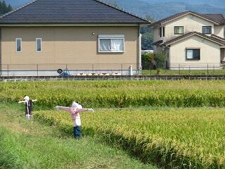 稲の生長具合の観察と、鳥よけに案山子を立てに行きました。