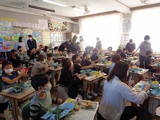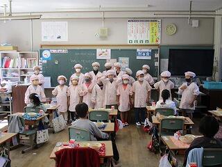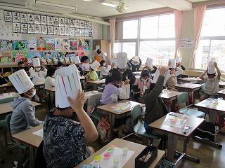 最後にシェフの帽子を全員にもらい、児童は嬉しそうでした。次の授業でもずっとかぶっていた児童もたくさんいました。体育でもかぶっていた!