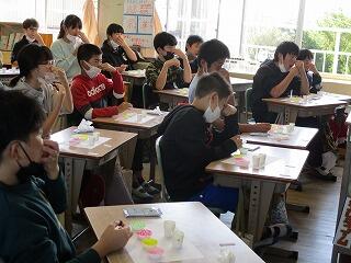 鼻をつまんでグミを食べると味がしないこと、鼻をつまんだ手を離すと味が広がる経験もしました。また、五味をそれぞれ、また味を混ぜて味見して自分の舌で学びました。