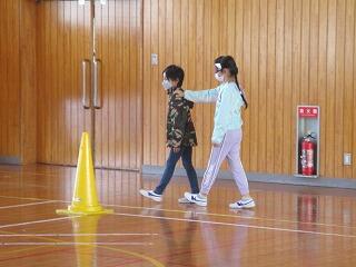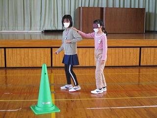 「車イスやアイマスク体験をして、体が不自由な人の気持ちに気づき、自分たちにできることを考えよう」をめあてにした総合的な学習の時間の一環です。