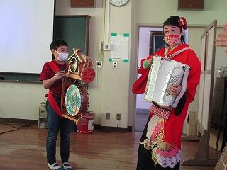 途中、宮田さんのアコーディオンの演奏のもと、かねと太鼓の演奏体験を2名がしました。1人は演奏しながらみんなを一回りしました。