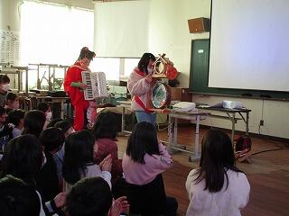 まず、チンドン屋とは、どんな仕事なのかビデオを視聴しました。その後、軽快な音楽にのって宮田さんが登場すると、児童は手拍子で迎えました。宮田さんを見たことがあったり知っていたりする児童は5,6名でした。