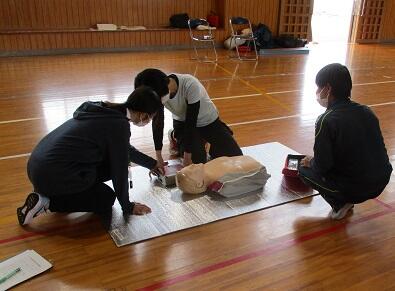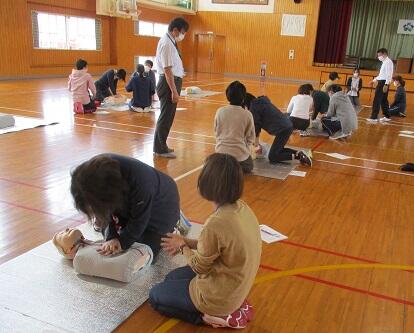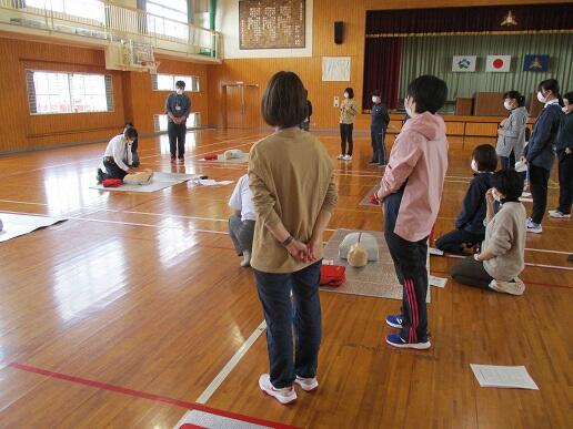 毎年水泳の授業が始まる前に、心肺蘇生法とAEDの使い方について講習を行っています。今年度は、普段より早いのですが、4月27日の午後に職員の研修として実施しました。都城消防局から2名の方に講師として来校していただき、短い時間でしたが、効率的に分かりやすく講習していただきました。実際に胸部圧迫やAEDを使用しました。チームで役割を分担したり、胸部圧迫を継続して行ったりしましたが、体力的に大変なことも感じました。水泳の授業が6月から始まりますが、他県ではスイミングスクールで幼いお子さんが亡くなる事故も起きています。子どもたちの命・安全を守る大切さを強く認識した講習でした。