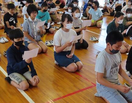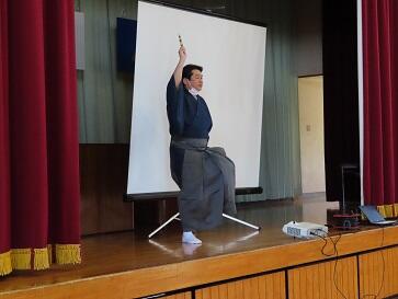 それから、謡(うた)と仕舞(しまい)に分かれて練習しました。演目は「舎利」で、鬼が神様を追いかける場面を教えていたできました。仕舞は各学級2名、他の児童は全員