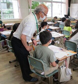5月に入ってから、外勢徹男さんと外勢浩子さんのお二人がボランティアで算数の学習の支援をしてくださっています。お二人は、本校の学校運営協議会の委員でもあります。月曜日と金曜日の午前中に来校され、各教室で学習支援をしていただいています。6月12日(月)は、4年生が支援をしていただきました。1組は、「垂直と平行」の単元で、平行な2本の直線の特徴について考える内容でした。平行な線の引き方や定規の使い方等、一人一人観ていただき、丁寧に教えていたただきました。子供たちも上手に平行な線を引き、平行な2本の直線の特徴について考えることができました。