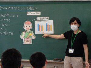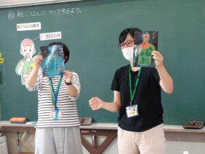 「朝ご飯について考えよう」というテーマで、朝ご飯のもつ3つの役割(頭・体・お腹の目覚ましスイッチを入れる。)について知るとともに、毎日朝ご飯を食べるためには、生活リズムを整えることが大切であることを学ぶことができたようです。