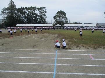 都城市内の6年生約1600名の児童が一堂に会して、選抜種目や一般種目で競い合いました。陸上教室の目的は、体力と技能・記録の向上はもちろんですが、参加する子供たちの親睦を図り、友情を育てることも目的の一つです。