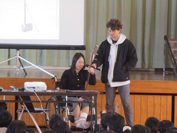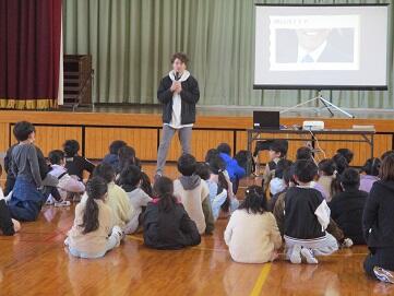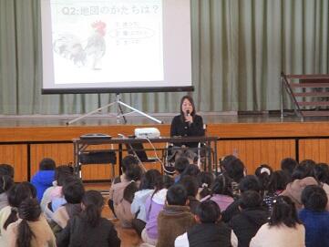 1月23日(火)に2名の国際交流委員の方が来校されました。今年度3回目の国際交流活動になります。今回は1校時に1年生、2校時に2年生、3校時4年生がそれぞれ1時間ずつ国際交流活動を行いました。内容は、1年生が各国の伝承遊びや行事の紹介、2年生は、各国の伝承遊びや鬼ごっこの遊びの体験、4年生は、各国の小学校での生活の紹介やクイズでした。