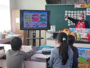 1月22日(月)~26日(金)全校各クラス1~2時間ずつ、カルビースナックスクールがありました。普段何気なく食べているお菓子やご飯ですが、実際にお菓子を食べて原材料を考えたり、おやつの時間や量、パッケージの見方について説明を聞いたりしました。みんなで協力して、ゲームで学ぶ活動もありました。クイズやゲームなど、とても楽しく学習していました。高学年では、家庭科で学習した知識とスナックスクールで習った知識を使って考えました。高学年の活動では、決まっている正解を当てるのではなく、自分たちで話し合い、ベストの考えを探すとともに、いろいろな考えに気付くことがねらいでした。