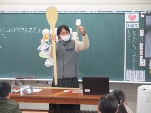 実際に給食センターで使っている道具も見たり、触れたりしました。家庭で使っているものとは、大きさも違い、大量の給食をつくるための工夫も知ることができました。