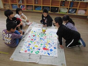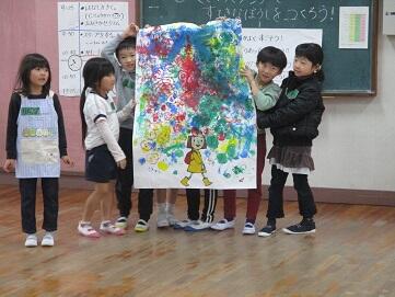 2月1日(木)の2・3校時に1年生は、高城幼稚園で幼稚園生と交流して学習をしました。今回は、絵本「ミリーのステキな帽子」の野菜スタンプを使っての表現活動でした。野菜スタンプの技法を体験し、友達と楽しみながら伸び伸びと表現し、チームで一つの作を作ることがねらいでした。1組~3組がそれぞれの教室で幼稚園生とチームを作って活動しました。まず、各チームに分かれてどんな帽子に仕上げていくかを考えました。その後イメージを野菜スタンプで表現しました。力を合わせて、仲良く作品作りに取り組んでいました。そしてそれぞれのグループが思い思いの作品を仕上げることができました。