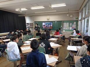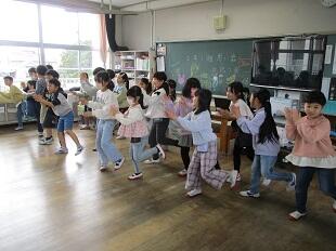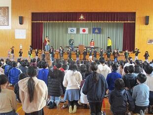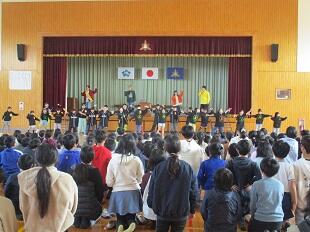 「上を向いて歩こう」のほか、3曲披露していただきました。2曲目には、「ダンスドージョー」に通う高城小学校の友達もステージ前で曲に合わせて踊り、素晴らしいダンスを披露しました。3曲目は全校みんなで一緒に踊りました。そして、最後の曲は、卒業する6年生への温かいメッセージになりました。