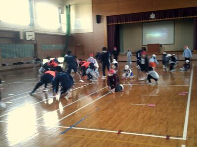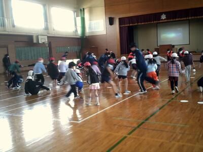 スポーツフェスタの赤団と白団で、オセロのように床に置かれた丸をひっくりかえして、自分の色をどんどん増やしていきます。
