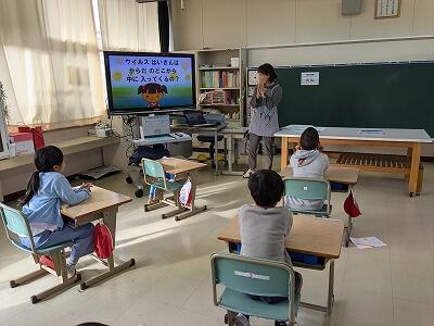 保健の先生のお話では、「手洗いうがい」について音読劇をしながら説明がありました。