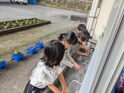 花王の「あわあわ手あらいの歌」に合わせて、手のひら、手の甲、指先、爪の間、指の間、親指、手首まであらいます。
