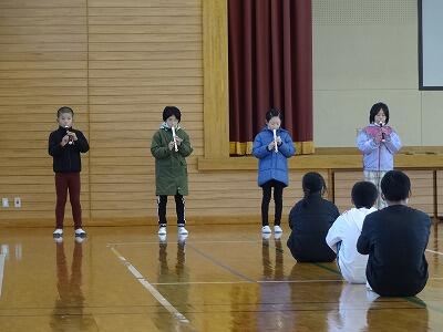 3・4年生が、朝の活動の時間【有水タイム】に体育館で発表を行いました。内容は、国語で学習した「ことわざ」の紹介、音楽で学習した歌とリコーダーの演奏でした。「ことわざ」では、例をもとに、分かりやすく紹介していました。歌では、「もみじ」の曲を二部に分かれて歌い、リコーダーでは、スタッカートに気をつけて吹いていました。堂々した発表でよく頑張っていました。