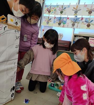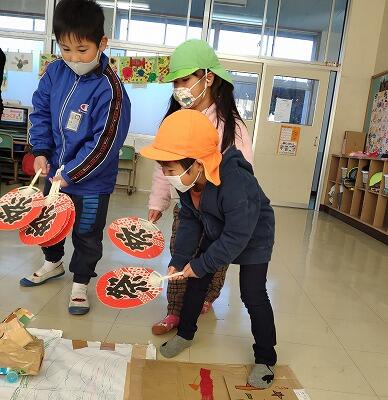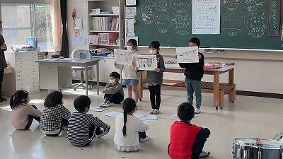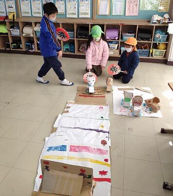 1・2年生が生活科の授業で作成したおもちゃを使って、「うごくおもちゃまつり」を開きました。当日は、こども園の年長さん・年中さんの園児を招待して行ないました。遊び方を説明し、実際に自分たちが作ったおもちゃで遊んでもらいました。楽しそうに遊ぶ年長さん・年中さんを見て、1・2年生も嬉しそうでした。