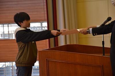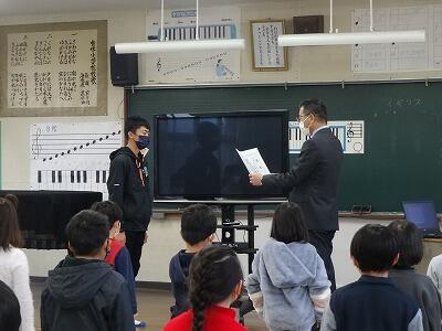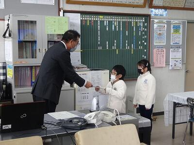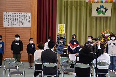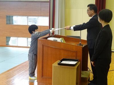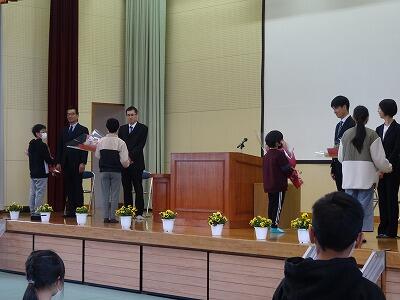 朝会後は、表彰がありました。明るい選挙書道コンクールの入者者と持久走練習期間を通して記録が大きく伸びた躍進賞の表彰でした。それぞれ代表児童が校長先生より賞状を受け取りました。おめでとうございます。