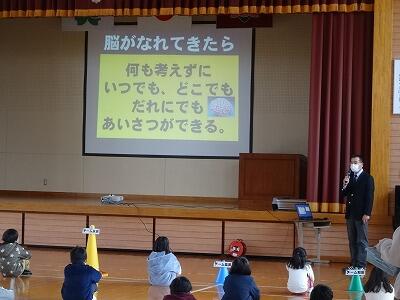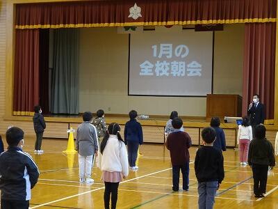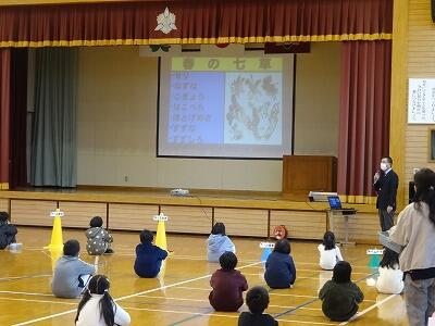 1月の全校朝会は、1月のトナえもん「春の七草」の確認でした。追加で2学期に唱えていた「秋の七草」の確認もしました。春と違って秋は時間が経っていることもあり、忘れてしまった児童もいましたが、しっかりと唱えることのできる児童もおり感心しました。その後、校長先生が始業式に話しをされた「上手なあいさつ」についての確認でした。寒い日など、なかなか元気な声が聞こえない時もありますが、脳がなれるまでしっかりと意識して取り組んでほしいと思います。