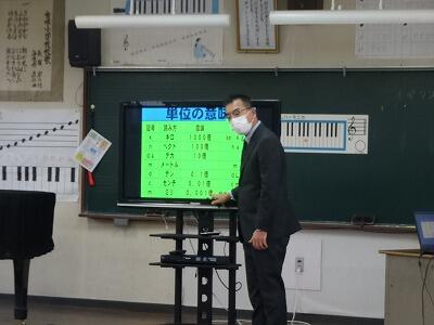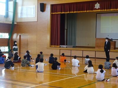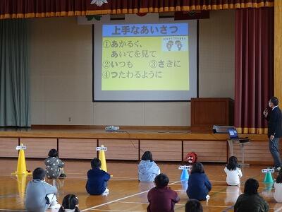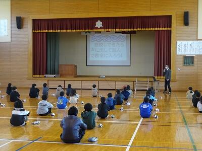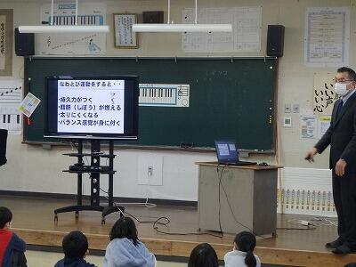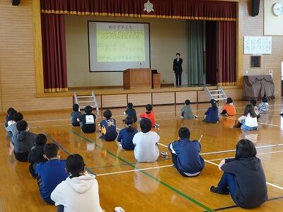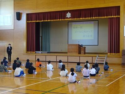 2月の全校朝会は、今月のトナえもん「単位を覚えよう」の確認でした。学年によっては、ちょっと難しいところもあるので、校長先生が分かりやすく説明をしていました。確認の後は、今、子どもたちが取り組んでいる「なわとび」についてでした。①なわとびをするとどんないいことがあるのか。②技の種類はどのくらいあるのか。③なわとびの世界記録はどのくらいなのか。みんな興味津々で聞いていました。そして、最後4つめは、「長なわとびの5つのコツ」でした。17日(金)のなわとび大会に向けて、さらに意欲が高まったことと思います。また、県読書感想文コンクールで2席に入った児童の表彰も行ないました。本を通して「命の意味」について考えた作文で、お昼の放送で、全校児童にも紹介したところでした。
