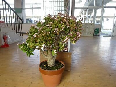 21代PTA会長 小林様が観葉植物「金のなる木」を持ってきてくださいました。。その名から縁起のよい木として知られているようです。花言葉を調べてみますと「幸運を招く」とありました。きっと有水小にたくさんの幸運をもたらしてくれることと思います。花が咲き終わる頃までしばらくお借りして、玄関先に飾らせてもらいます。