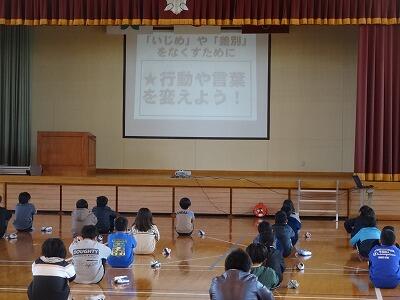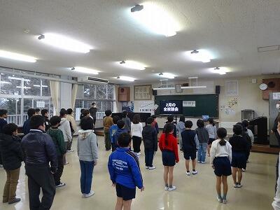 3月の全校朝会は、今年一年間の「トナえもん」の確認でした。一つ一つ、月ごとに唱えていきましたが、さすは上級生。しっかりと覚えていて、全校のお手本になっていました。子どもの記憶力はすごいです。確認の後は、「いじめや差別をなくすために」ということで「めざす児童像」とあわせて話しがありました。「自分も人も大切にする子ども」に向け、さらに意識が高まったことと思います。