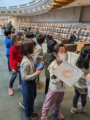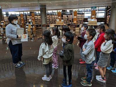 1・2年生が、生活科の時間を使って、市立図書館に校外学習に出かけました。図書館では、館内のいろいろなコーナーを一つ一つ説明していただきながら、見学して回りました。広い広い図書館。たくさんたくさんの本。子どもたちは、興味津々でした。