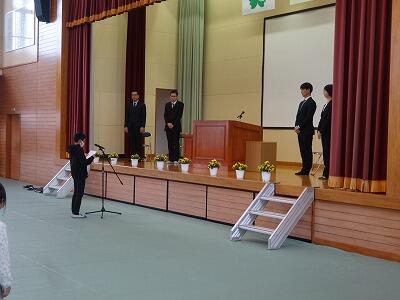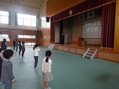 いよいよ今年度締めくくりの式です。6年生が卒業し、少し体育館が寂しい感じがしました。修了式では、各学年の代表児童が、校長先生から修了証を受け取りました。その後、3年生が全校児童を代表して、作文を発表しました。校長先生からは、節目をテーマに、今年一年間の振り返りと春休みの大切さについて話がありました。明日から、春休み、安全に気を付けて過ごしてほしいと思います。