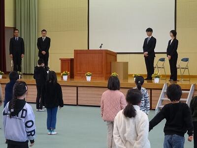 本年度の定期異動に伴い、学校を去られる先生方との離任式が行われました。式では、お一人ずつ挨拶をしていただいた後、5年生が代表してお別れの挨拶をしました。最後は、みんなでアーチをつくって見送りました。子どもたちに寄り添ったあたたかいご指導ありがとうございました。新転地でのご活躍をお祈りいたします。