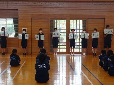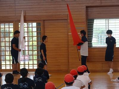 式では、中学校の生徒会によるスローガン発表、団長による団の色決定、応援練習等が行われました。応援リーダーも、もちろん小学校・中学校合同メンバーです。色が決まったことで、更に意識が高まってくることと思います。行事を通して、たくさんのことを学ぶいい機会です。今後の活動が楽しみです。
