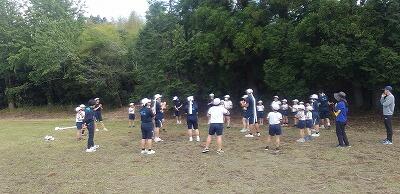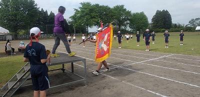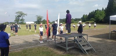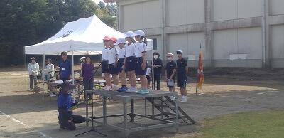 スポーツフェスタに向け、小中合同の練習が有水中運動場で行われました。中学校の実行委員長から心構えの話があった後、開閉会式の練習をしたり、団ごとにリーダーを中心に応援の練習をしたりしました。中学生の動きをお手本に一生懸命ついていく小学生でした。