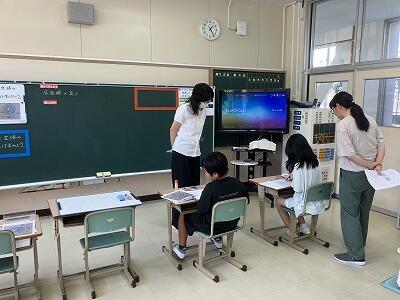 有水小学校は、子どもたちが自分たちで問いをもって解決しようとする授業を目指して、教師が「わ(脇役に徹する)・さ(先を読む)・び(微細な変化に気付く)」の視点で授業を研究しています。
