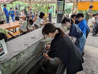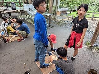 指導員の方の説明を聞いて、まいぎり式の火おこしにチャレンジしました。参加者の3割が成功すればすばらしいという難しさだそうで、最初は子供たち苦戦していました。最後まであきらめないと根性をみせて、なんとすべての班が火おこしに成功しました。有水小の子供たちのがんばりはすごい!この火は、この後の野外炊飯で使用するので、ろうそくに付けて、大切に管理していました。