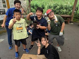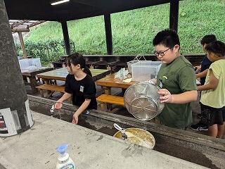 今日の夕食は、子供たちが班で協力してつくりました。かまど番で火の管理をする係や材料を準備して調理する係等、自分たちで相談しながら進めて、どの班もカレーができあがりました。調理室jからマカロニサラダとゼリーを運んで、班ごとに「いただきます!」おいしいカレーにみんな舌鼓、大満足でした。ただ、食べた後の後片付けのチェックにより片づけをやり直しする中で、次の人がつかうためにきれいにすることが大切なことや、片付けを丁寧すること等も学べだようです。